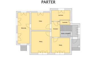 Parter: 3 pokoje, kuchnia, łazienka, korytarz, weranda