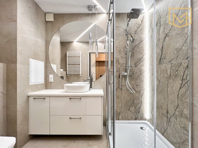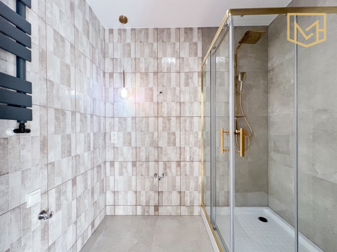 Lokal został przygotowany do użytkowania w spójnym, neutralnym standardzie. Obejmuje to wykończenie ścian, podłóg, łazienek oraz instalacji. Dodatkowo zastosowano stolarkę okienną trzyszybową z roletami zewnętrznymi oraz ogrzewanie miejskie. Rozdzielono podlicznikami instalacje elektryczną i wodę.