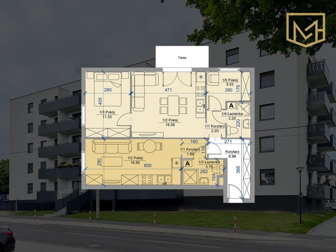 • pokój z aneksem kuchennym (16,80 m²)