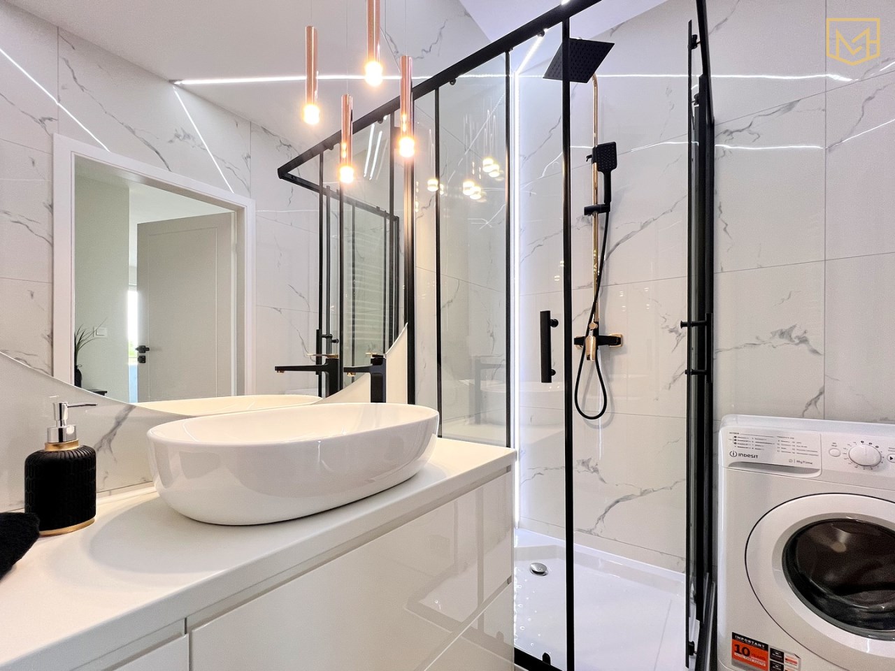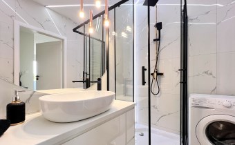 - łazienka z prysznicem, pralką oraz zabudową meblową,
